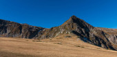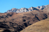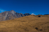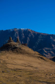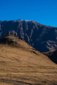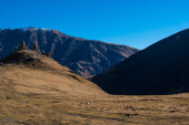 Kazbegi, Georgia : 10-11-2022 : amazing panorama of ancient Gergeti Trinity Church and glorious Caucasus mountains, Panoramic landscape of beautiful natural mountains peaks and meadow, Kazbegi, Georgia