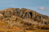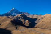 Zdjęcie "Kazbegi, Georgia : 10-11-2022 : amazing panorama of ancient Gergeti Trinity Church and glorious Caucasus mountains, Panoramic landscape of beautiful natural mountains peaks and meadow, Kazbegi, Georgia" może być wykorzystywane do celów osobistych i komercyjnych zgodnie z warunkami zakupionej licencji Royalty-free. Obraz jest dostępny do pobrania w jakości wysokiej rozdzielczości do 5760x3840.