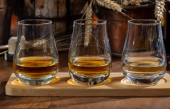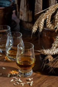 Speyside Scotch szklanki degustacja whisky na starym ciemnym drewnianym stole vintage z ziaren jęczmienia zbliżyć