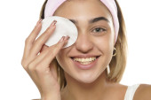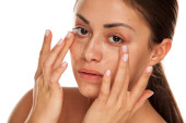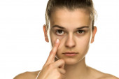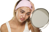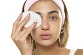 młoda kobieta dotyka swoich majtek na białym tle studia