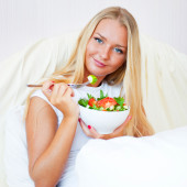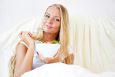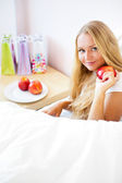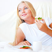 kobieta o śniadanie w łóżku. zdrowe śniadanie kontynentalne. ca