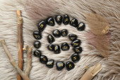 Zdjęcie "Stos czarnych kamieni runicznych na drewnianym stole" może być wykorzystywane do celów osobistych i komercyjnych zgodnie z warunkami zakupionej licencji Royalty-free. Obraz jest dostępny do pobrania w jakości wysokiej rozdzielczości do 5760x3840.