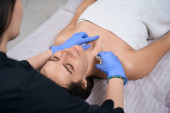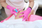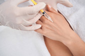 Pielęgniarka w rękawiczkach ochronnych i strzykawce do trzymania płaszcza oraz wykonywanie wstrzyknięć kosmetycznych w ręce klienta