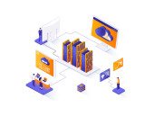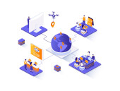 Izometryczny baner internetowy logistyki. Ekspresowa dostawa, koncepcja izometrii firmy logistycznej. Spedycja 3d sceny, magazynowanie i dystrybucja płaska konstrukcja. Ilustracja postaci z ludźmi.