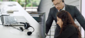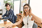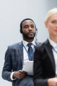 boczny widok młodego i kręconego Indianina w słuchawkach i żółty sweter mówiący i gestykulujący w pobliżu mikrofonów i uśmiechnięta brunetka rozmówca w szarej marynarce w studiu radiowym, baner
