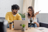 uśmiechnięta brunetka w szarej marynarce pisząca w notesie blisko młodego i wesołego Indianina w żółtym swetrze w pobliżu mikrofonów, laptopa, kawy na wynos, słuchawek i smartfona w studio