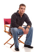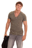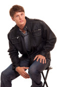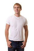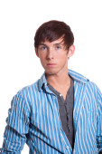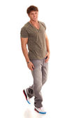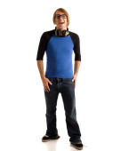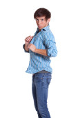 młody człowiek w niebieskie dżinsy i koszulę. łapka na biały.