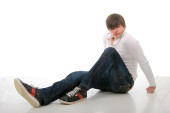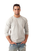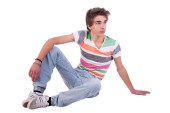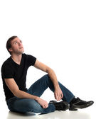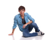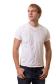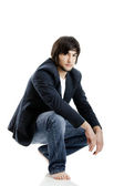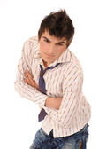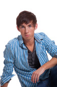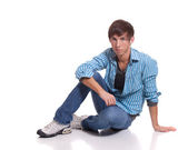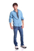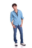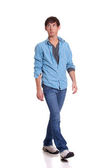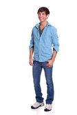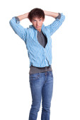 młody człowiek w niebieskie dżinsy i koszulę. łapka na biały.