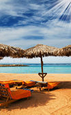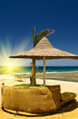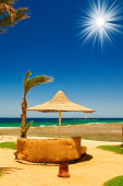 palmy, parasol i morze przeciw błękitne niebo.