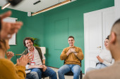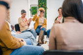 Zdjęcie "Grupa ludzi siedzących w kręgu z dwoma terapeutami i kobietą w centrum, dyskutującą i zapewniającą jej wsparcie emocjonalne." może być wykorzystywane do celów osobistych i komercyjnych zgodnie z warunkami zakupionej licencji Royalty-free. Obraz jest dostępny do pobrania w jakości wysokiej rozdzielczości do 5760x3840.