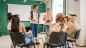 Grupa ludzi siedzących w kręgu z dwoma terapeutami i kobietą w centrum, dyskutującą i zapewniającą jej wsparcie emocjonalne.
