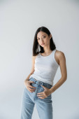 Zdjęcie "pełna długość młoda i beztroska kobieta z naturalnym makijażem, brunetka włosy i idealna skóra siedzi w dżinsach dżinsy i top zbiornika i patrząc daleko na białym tle " może być wykorzystywane do celów osobistych i komercyjnych zgodnie z warunkami zakupionej licencji Royalty-free. Obraz jest dostępny do pobrania w jakości wysokiej rozdzielczości do 5760x3840.