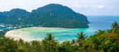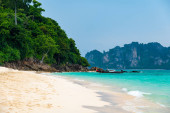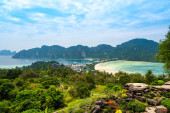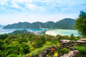 Widok z lotu ptaka na wyspy Ko Phi Phi, Tajlandia. Widok z punktu widzenia tropikalnej wyspy, plaży i oceanu z długimi łodziami ogonowymi. Egzotyczna przyroda, letnia pogoda.