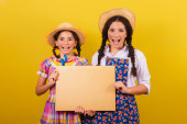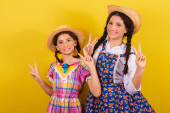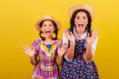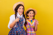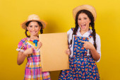 siostry i przyjaciele, ubrani w typowe ubrania Festa Junina. wskazując na horyzont, spójrz tam.