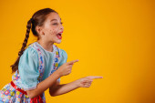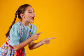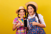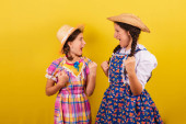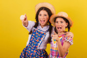 Zdjęcie "siostry i przyjaciele, ubrani w typowe ubrania Festa Junina. niespodzianki, wow, niesamowite, niewiarygodne." może być wykorzystywane do celów osobistych i komercyjnych zgodnie z warunkami zakupionej licencji Royalty-free. Obraz jest dostępny do pobrania w jakości wysokiej rozdzielczości do 5760x3840.