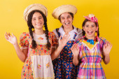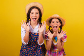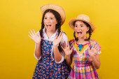 siostry i przyjaciele, ubrani w typowe ubrania Festa Junina. niespodzianki, wow, niesamowite, niewiarygodne.