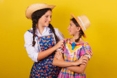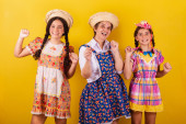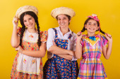 babcia i jej dwie wnuczki ubrane w typowe ubrania Festa Junina. Przytulanie i uśmiech.