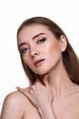 Piękna młoda kobieta dotykając twarzy i cieszyć się doskonałą skórę na białym tle