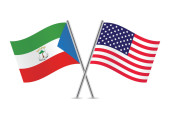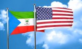 Flagi Stanów Zjednoczonych Ameryki i Gwinei Równikowej na tle nieba. Ilustrujące międzynarodową dyplomację, przyjaźń i partnerstwo z wznoszącymi się flagami pod niebem. 3D ilustracja