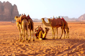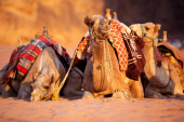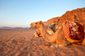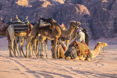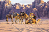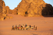 Jordan, Wadi Rum - 2 listopada 2022: Przyczepa wielbłądów z droverami na pustyni, góry skalne o zachodzie słońca