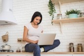 wytatuowana młoda kobieta w okularach, krótkie włosy i grzywka trzymająca i używająca laptopa podczas pracy w domu w białej i nowoczesnej kuchni, niewyraźne tło, zdalny tryb życia, freelancer