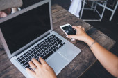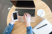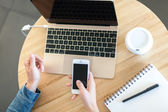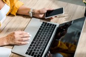 widok z góry wytatuowany kobieta gospodarstwa smartfon z pustym ekranem w pobliżu laptopa, notebook, i filiżanka kawy ze spodkiem na białym stole podczas pracy w domu, freelancer, nowoczesne miejsce pracy