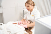 Zdjęcie "Piękna kobieta na zabiegu laserowej nawierzchni skóry, kosmetolog w rękawiczkach ochronnych wykorzystuje laser CO2" może być wykorzystywane do celów osobistych i komercyjnych zgodnie z warunkami zakupionej licencji Royalty-free. Obraz jest dostępny do pobrania w jakości wysokiej rozdzielczości do 5760x3840.
