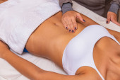 zbliżenie brzucha kobiety, zdjęcie estetyki, zabiegi na brzuchu. klinika kosmetyczna.