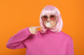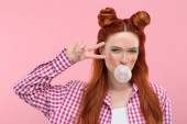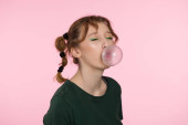 Piękna kobieta dmuchanie guma do żucia na zielonym tle