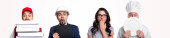 Radosne i wieloetniczne nastolatki w białych koszulkach, pozujące i patrzące w kamerę, stojące obok siebie odizolowane od szarej, żywej koncepcji nastolatek, baner