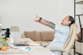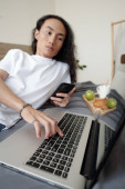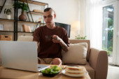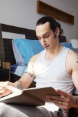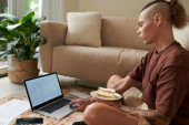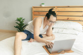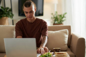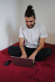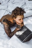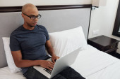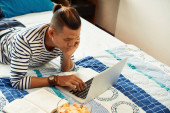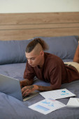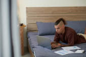 Poważny młodzieniec leżący na łóżku, czytający i poprawiający dokumenty na laptopie