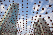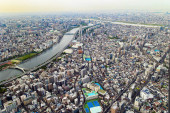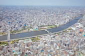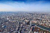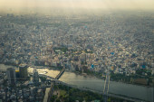 Tokio jest pokryte smogiem. Widok z tarasu widokowego wieży. Najdłuższą rzeką w Tokio jest Sumida-gawa..