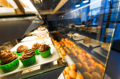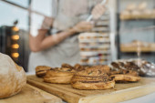 Wysoki kąt życia młodej sprzedawczyni lub właścicielki piekarni lub stołówki wystawiającej ciasta na pokaz lub wyjmującej je podczas obsługi klientów
