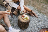 Wesoła para z winem rozmawia siedząc na leżakach w pobliżu jedzenia i drewna na wolnym powietrzu