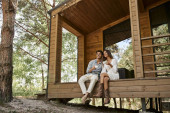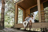 Zdjęcie "Pozytywne romantyczna para gospodarstwa wina i stojąc w pobliżu grilla i domku na tle" może być wykorzystywane do celów osobistych i komercyjnych zgodnie z warunkami zakupionej licencji Royalty-free. Obraz jest dostępny do pobrania w jakości wysokiej rozdzielczości do 5760x3840.