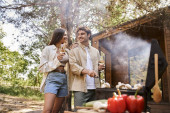 Zdjęcie "Wesoły mężczyzna trzyma koc w pobliżu dziewczyny z winem, grillem i letnim domkiem w tle" może być wykorzystywane do celów osobistych i komercyjnych zgodnie z warunkami zakupionej licencji Royalty-free. Obraz jest dostępny do pobrania w jakości wysokiej rozdzielczości do 5760x3840.