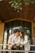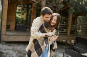 Wesoły mężczyzna trzyma koc w pobliżu dziewczyny z winem, grillem i letnim domkiem w tle
