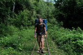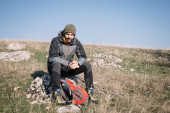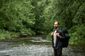 indiański Backpacker uśmiechając się i trzymając kije trekkingowe na naturalnej ścieżce w lesie, koncepcja przygody