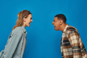 obudzić Afrykański amerykański mężczyzna trzymając budzik i budząc śpiąca kobieta na niebieskim tle