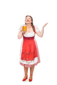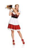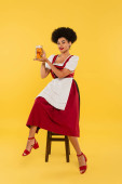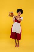 szczęśliwy afrykański amerykański oktoberfest kelnerka w tradycyjnym stroju z piwem i hot dogiem na białym