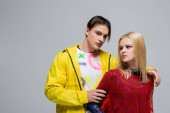 blondynka nastolatek dziewczyna patrząc na aparat w pobliżu ruda chłopak modne nastolatki pozowanie na szary
