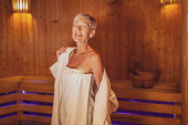 kobieta w średnim wieku z ręcznikiem na głowie i nawilżające przepaski na oczy biorące kąpiel w nowoczesnym mieszkaniu