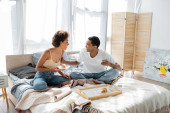 wieloetniczna para patrząca na siebie i siedząca na łóżku w wiejskim domu z widokiem na las