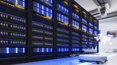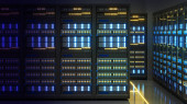Strzał w centrum danych z wieloma rzędami w pełni operacyjnych stojaków serwerowych. Nowoczesna telekomunikacja, chłodzenie centrum danych, serwerownia, renderowanie 3d