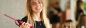 szczęśliwy nastolatek dziewczyna w stylowe ubrania szczotkowanie włosów i patrząc na aparat na różowym tle, baner