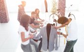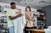 częściowy widok czarnego człowieka z tabletem cyfrowym wskazującym na t-shirty o rozmiarach formatowych, baner