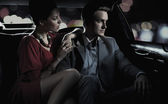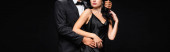 kochająca wielokulturowa para w wieczorowych strojach z winem rozmawiającym i patrzącym na siebie, sztandar