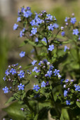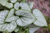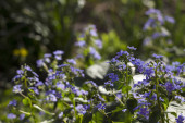 Largeleaf Brunnera macrophylla Jack Frost (syberyjski chrząszcz, nie zapominaj o mnie) - zielona roślina z niebieskimi kwiatami w ogrodzie