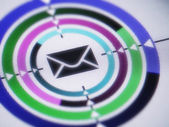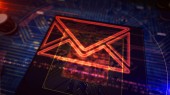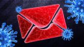 Zainfekowana ikona czerwonego e-maila jest wykrywana podczas skanowania na ciemnym tle hi-tech w binarnej cyberprzestrzeni. Ilustracja 3D.