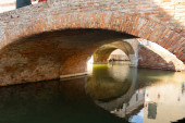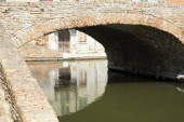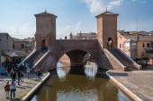 Comacchio, Włochy-2 czerwca 2023: ludzie spacerują w Comacchio przed słynnymi trzema mostami w słoneczny dzień